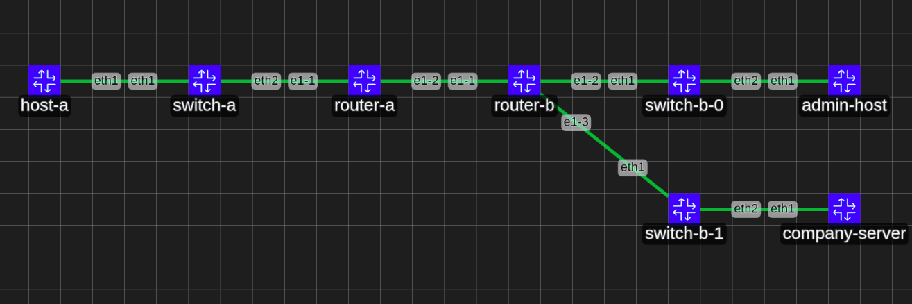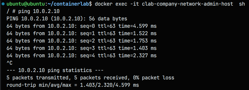 - Hosts: Alpine Linux (admin-host, host-a, company-server)